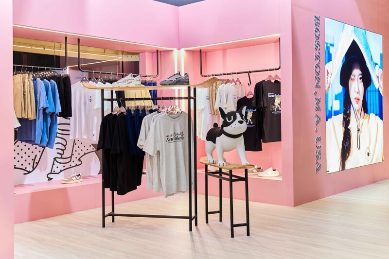 本次快闪店以《NB BOY 夏日乐游站》为主题,展现属于NB BOY的日常旅程,搭配上海洋蓝、蜜桃粉、清新莱姆为基调的春日粉嫩色系,结合插画呈现 NB BOY的生活片段,像是有滑板公园的奔驰、有都会旅人车厢的穿梭、还有街边咖啡厅,其中最大亮点莫过于快闪店入口的巨型NB BOY公仔装置,以及墙上装饰的大面积IU全新形象美照。